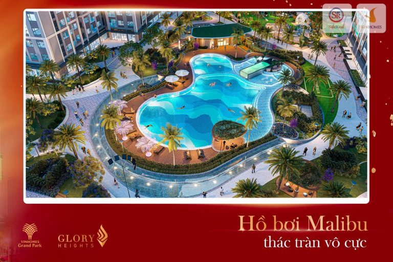 Điểm nhấn đầu tiên trong hệ tiện ích Glory Heightes chính là hồ bơi Malibu quy mô với diện tích lên đến 845m2, gồm hồ bơi dành cho người lớn, trẻ em và phần hồ thác tràn vô cực. Thiết kế ấn tượng này mang đến trải nghiệm đắm mình vào vẻ đẹp mộng mơ của thành phố biển nổi tiếng Malibu ngay nội khu dự án.